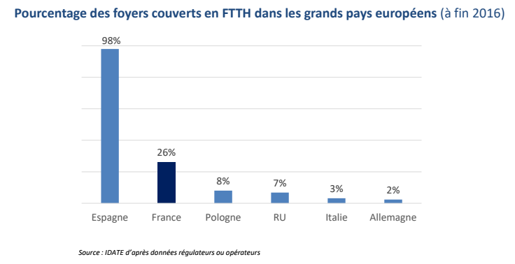 Pierre Louette a notamment présenté une étude de l’Idate pour la FFT, sur l’accès au FFTH dans les grands pays européens. Ce rapport se base ainsi sur les 6 pays qui ont le plus important territoire à couvrir en fibre. Dans ce contexte, c’est très largement l’Espagne qui arrive en tête, avec 98% de la population qui est raccordable au FTTH. Nettement en dessous, mais quand même à la deuxième place, on trouve la France avec 26% des foyers raccordables à la fibre. La Pologne, le Royaume Uni, l’Italie est l’Allemagne arrive encore plus loin derrière.