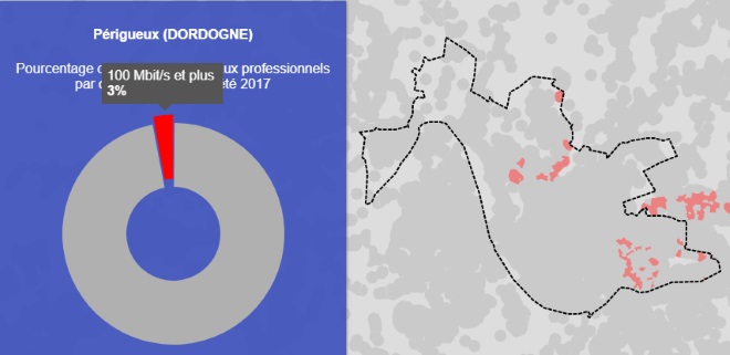 Grâce à la première carte on peut voir que la ville de Périgueux est couverte à 43.9% par le très haut débit.