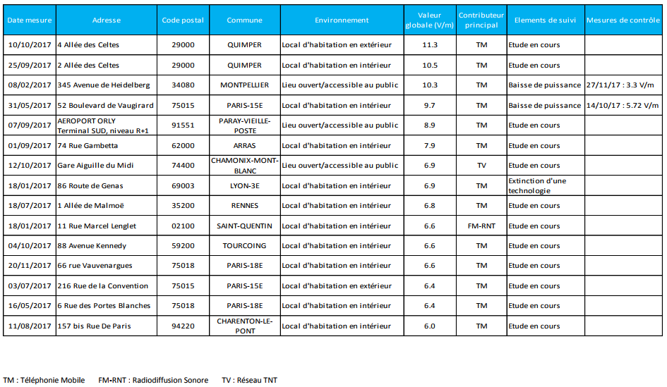 L’Agence nationale des fréquences (ANFR) publie la première liste de « points atypiques ». Il s’agit de lieux où les niveaux d’exposition du public aux ondes électromagnétiques dépassent substantiellement ceux généralement observés à l’échelle nationale. L’exposition de ces points reste néanmoins toujours inférieure aux valeurs-limites prévues par la réglementation (les valeurs-limites sont fixées par un décret entre 28 V/m et 87 V/m, selon les fréquences utilisées).