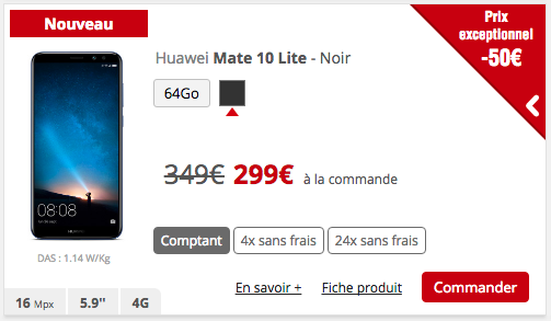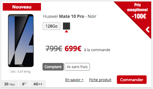 Le Huawei Mate 10 Pro noir en 120Go passe de 799 euros à 699. Ou bien en 4 fois sans frais,177€ à la commande puis 3 fois 174€.