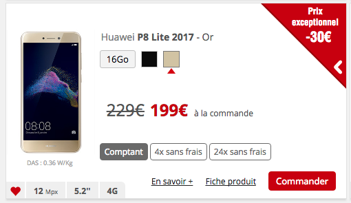 Un autre nouvelle baisse de tarif temporaire concerne le Huawei P8 Lite 2017 en 16Go, or ou noir, il passe de 229 euros a 199. Ou en 4 et 24 fois sans frais : 52€ à la commande puis 3 fois 49€/31€ à la commande puis 24 fois 7€.
