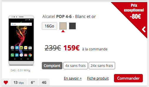 L’Alcatel POP 4-6 16Go en blanc et Or passe lui de 239 à 159 euros. La promotion s’applique aussi au payement en plusieurs fois : 4x : 42€ à la commande puis 3 fois 39€ ou encore 24x : 39€ à la commande puis 24 fois 5€.
