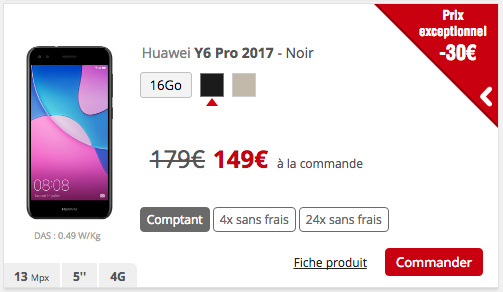 Enfin, le Huawei Y6 Pro 2017 passe lui de 179 euros a 149. AVec possibilité de payer en 4 et 24 fois sans frais : 38€ à la commande puis 3 fois 37€ ou 29€ à la commande puis 24 fois 5€.