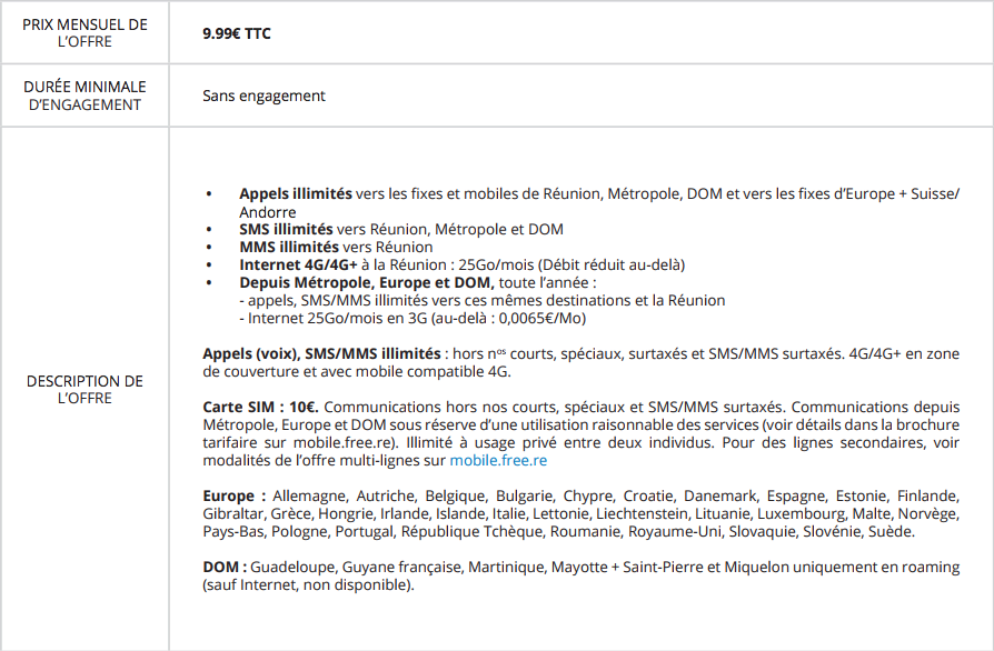 Les nouveaux tarifs et nouvelles modifications sont appliqués depuis le 1er janvier 2018 tout comme en France métropolitaine. Vous pouvez découvrir la brochure tarifaire à l’adresse suivante : https://mobile.free.re/docs/tarifs.pdf