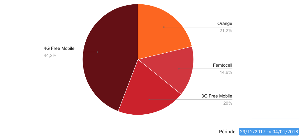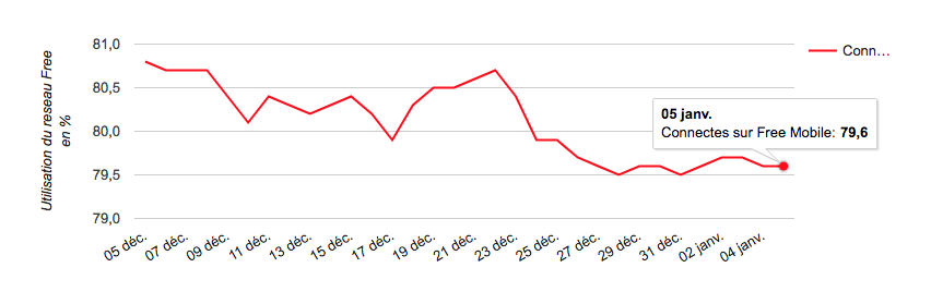 Ce n’est pas une surprise, les vacances impactent négativement le taux d’utilisation du réseau propre de Free. Si le 22 décembre dernier soit au premier jour des vacances de Noël, les abonnés Free Mobile utilisant l’application Free Mobile Netstat étaient connecté 80,8% du temps sur le réseau de l’opérateur, pratiquement au niveau du record atteint le 1er décembre (80,9%), celui-ci n’a fait que dégringoler depuis. D’ailleurs depuis la rentrée du 3 janvier, aucun signe d’amélioration n’est visible, le taux végète à 79,6%, ce n’est probablement qu’une question de jours avant qu’il ne grimpe en flèche à l’instar de chaque rentrée. Beaucoup de français seraient donc encore sur les routes ou sur leurs lieux de villégiatures, en province ou ailleurs. D’ailleurs le temps passé sur le réseau Orange soit en itinérance, a augmenté de 1pt pendant les vacances. Le temps passé sur le réseau 4G de Free a quant à lui baissé de 1,7pt. En 3G, le taux reste relativement stable, passant de 19,7% au début des vacances à 20% cette semaine. Sur le Femtocell, l’augmentation est de 0,6pts, logique également.