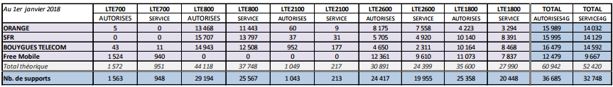 L’ANFR vient de publier les chiffres de déploiement des réseaux mobiles au 1er janvier 2018 A cette date, 38 579 sites sont autorisés par l’ANFR, dont 34 448 sont en service, pour la téléphonie mobile très haut débit (4G) tous opérateurs confondus. Sur l’ensemble de l’année 2017, le nombre de sites 4G autorisés a augmenté de 21 % et celui des sites mis en service de 25 %.