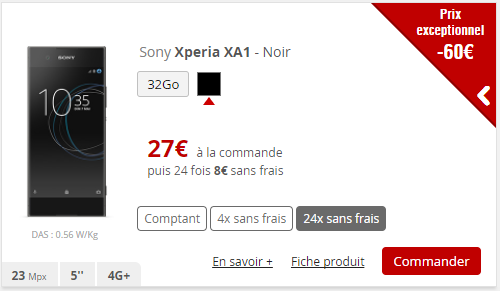 La première concerne le Sony Xperia XA1 (noir, 32Go). Une réduction temporaire de 60 euros fait passer le prix de 279€ à 219€. Ou bien en plusieurs fois sans frais. 4x : 57€ à la commande puis 3 fois 54€. 24x : 27€ à la commande puis 24 fois 8€.