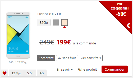 Enfin, la dernière réduction de prix temporaire de 50 euros est appliquée au Honor 6X (Or ou gris en 32Go). il passe de 249€ à 199€. En plusieurs fois sans frais cela correspond à 52€ à la commande puis 3 fois 49€ en 4 fois, ou bien 31€ à la commande puis 24 fois 7€.