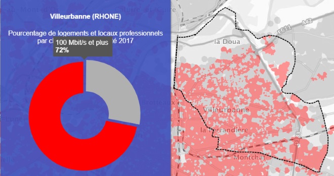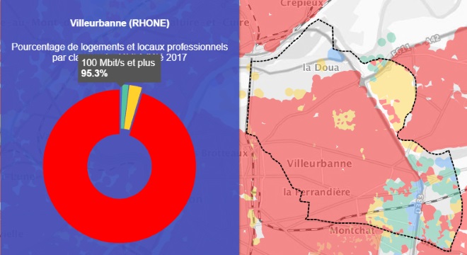 Grâce à la première carte on peut voir que la ville de Villeurbanne est couverte à 95.3% par le très haut débit