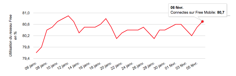 Hormis pendant les vacances de Noël, la tendance était positive et constante depuis novembre dernier grâce au déploiement progressif de sites 4G et 3G de Free et notamment à la mise à jour Samsung mettant fin aux blocages intempestifs en itinérance Orange. Mais depuis le 12 janvier 2018 et un nouveau record atteint (81%), le taux d’utilisation du réseau propre de Free est en dents de scie.