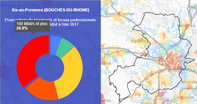 Grâce à la première carte on peut voir que la ville du Aix-en-Provence est couverte à 54% par le très haut débit