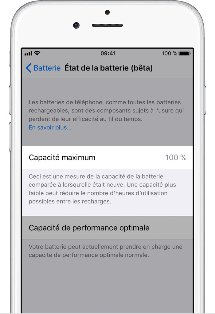 Sous l’état de la batterie une section intitulée “capacité de performance optimale” sera dédiée à la fameuse gestion des performances. Votre appareil vous indiquera si la limitation des performances a été activée, s’il n’arrive pas a déterminer l’état de la batterie ou s’il constate que son été est dégradé, un message vous orientera vers un fournisseur de services agréé par Apple pour un remplacement.