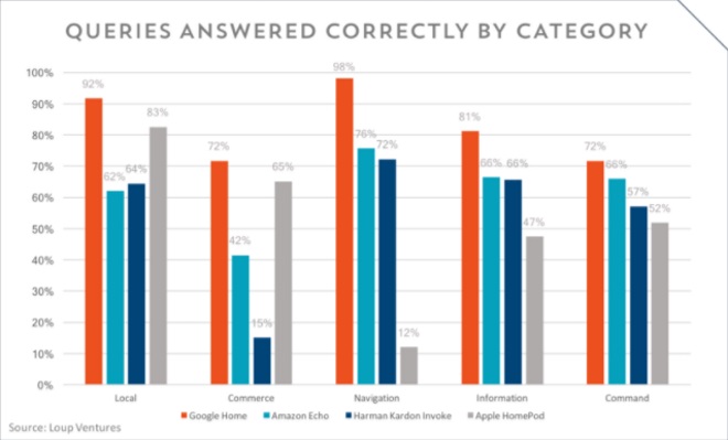 Dans les domaines tels que la navigation, le calendrier, les appels ou encore le courrier électronique, Siri n’est pas capable de fournir de réponses, toujours d’après Loup Ventures. Le score de Siri passe de 52,3 à 67% si on retire les questions portant sur ces domaines, un meilleur score, qui reste tout de même en dessous des 81% de l’enceinte Google Home.