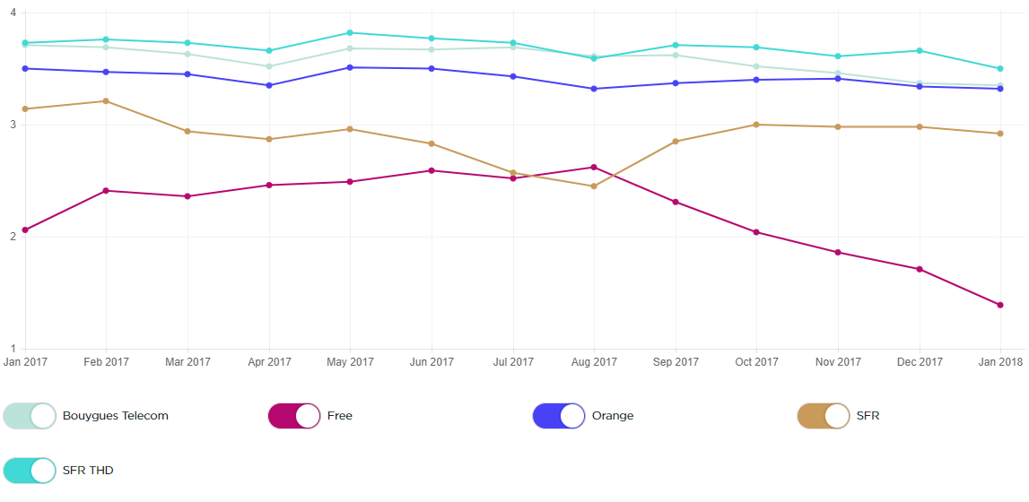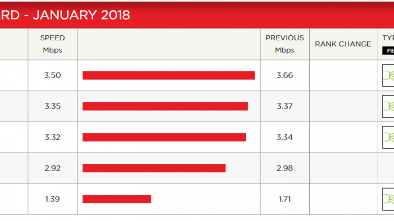 Concrètement, au cours du mois de novembre SFR "câble et FTTH" affichait un débit moyen de 3,50 Mbits/s, en légère diminution, alors que Bouygues Télécom, affiche 3,35 Mbits/s, en légère augmentation depuis le mois dernier. A la 3ème place on trouve Orange avec 3,2Mbits/s suivi par SFR "ADSL" avec 2,92Mbits/s. Enfin, à la dernière place, Free chute encore et affiche un débit moyen de 1,39 Mbits/s.