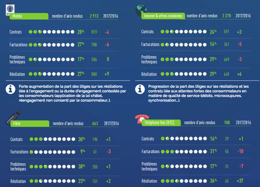 Première constatation, l’effritement de la part du mobile se poursuit depuis 2013, une tendance liée à la part croissante des abonnements mobiles sans engagement. Ce qu’il faut retenir en 2017, c’est une forte hausse de la part des litiges portant sur les résiliations. Sur le mobile, elles sont liées à l’engagement ou la durée d’engagement contestés par les consommateurs (application de la loi châtel, réengagement non consenti par le consommateur..). Sur l’adsl, celles-ci découlent des attentes fortes des consommateurs en matière de qualité de service (débits, microcoupures, synchronisation…)