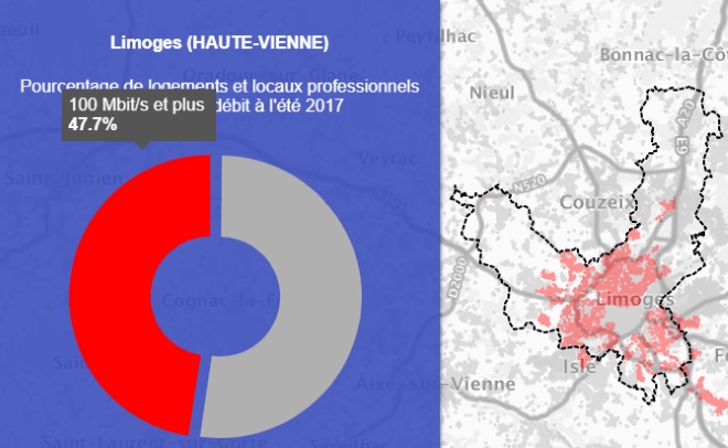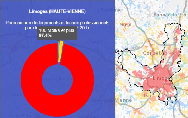 Grâce à la première carte on peut voir que la ville de Limoges est couverte à 97.4% par le très haut débit