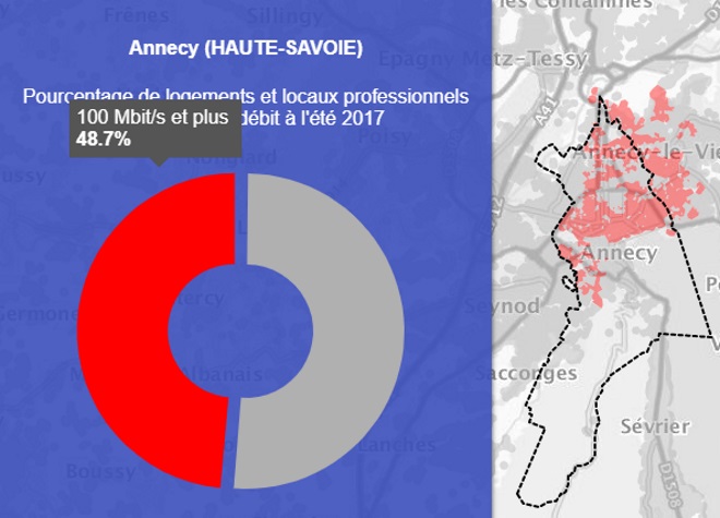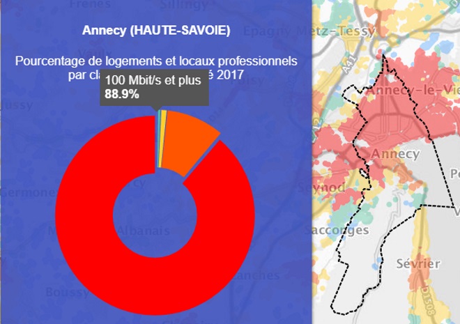 Grâce à la première carte on peut voir que la ville de Annecy est couverte à 98.4% par le très haut débit