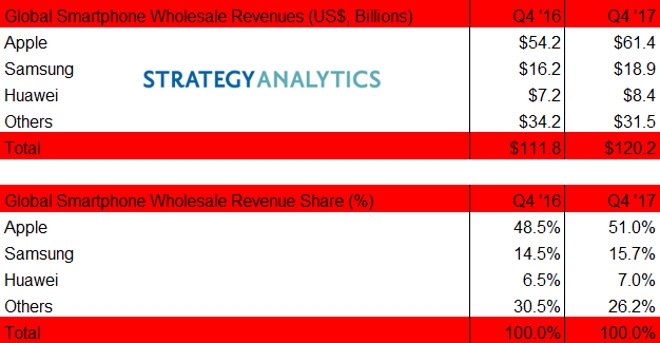 Avec un prix moyen de 254 dollars, Samsung a également amélioré ses ventes de smartphones, mais seulement de 2,7 milliards de dollars. La firme dirigée par Tim Cook, au niveau du chiffre d’affaires, a largement dépassé la marque sud-coréenne qui reste tout de même à la première position mondiale concernant le volume. Au dernier trimestre 2017, le géant sud-coréen a écoulé pour 18,9 milliards de dollars de smartphones ce qui représente 15,7% des revenus du secteur. Le constructeur chinois Huawei, ayant vendu pour 8,4 milliards de dollars se retrouve en troisième position avec un panier moyen estimé a 205 dollars ainsi que 7% du marché.
