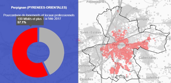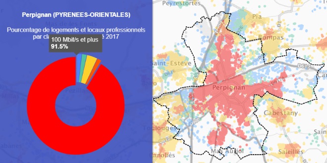 Grâce à la première carte on peut voir que la ville de Perpignan est couverte à 93% par le très haut débit.