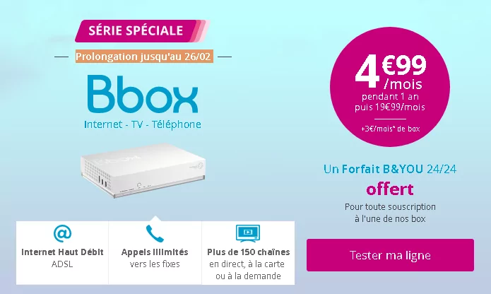 Or, en plus des 4,99€/mois, mis en avant sur le site de Bouygues Télécom ou encore sur les annonces sponsorisées sur Google, il faut ajouter 3€/mois de location de box, soit 7,99€/mois au total, durant la 1ère année. Cela complique donc la comparaison des tarifs chez les différents opérateurs.