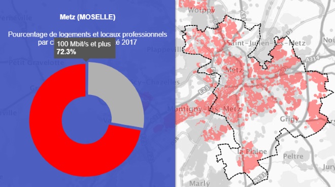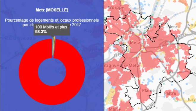 Grâce à la première carte on peut voir que la ville de Metz est couverte à 98.7% par le très haut débit.