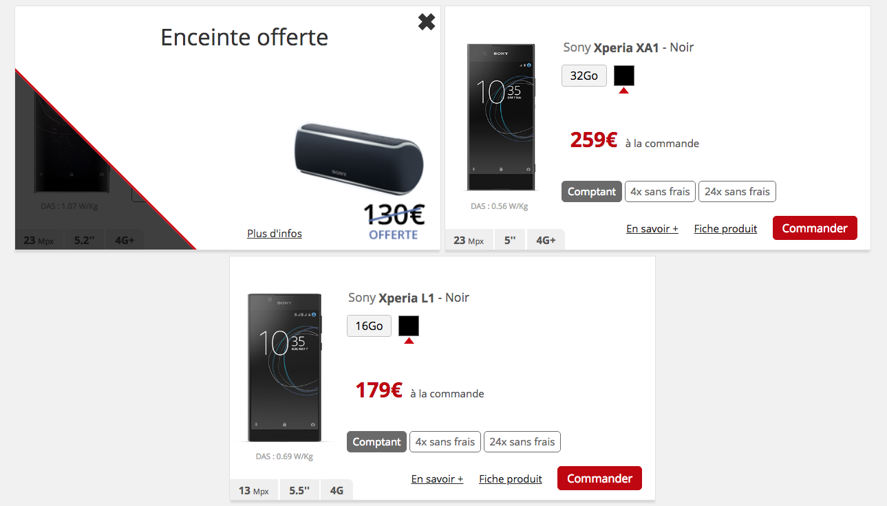Ainsi, le Sony Xperia XA1 passe de 279 à 259€ et le Xperia L1 voit son prix baisser de 20€, soit de 199€ à 179€. A noter qu’une enceinte XB 21 d’une valeur de 130 euros est offerte jusqu’au 31 mars 2018 pour l’achat du XA1.