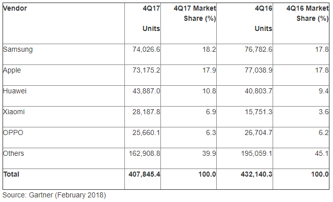 Samsung conserve sa position de leader malgré un recul de 3,6% au quatrième trimestre 2017 face à Apple qui enregistre un recul de près de 5% sur ses ventes d’iPhone.