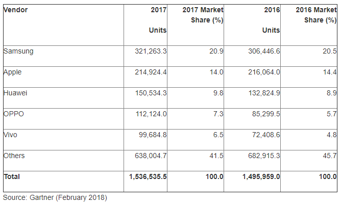 Au total en 2017 les ventes de smartphones ont dépassée le milliard et demi d’unités écoulées, en augmentation de 1,6% par rapport à l’année 2016.
