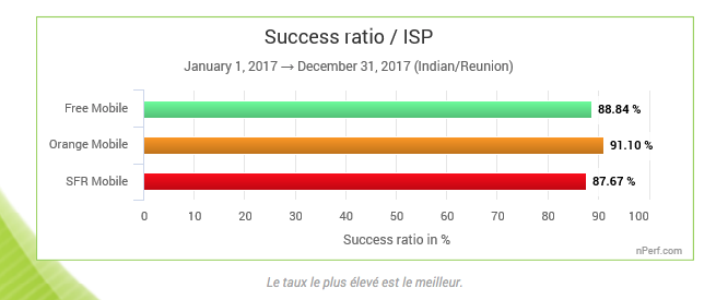 Première constatation, Orange obtient le meilleur taux de réussite à la Réunion au cours de l’année écoulée. L’opérateur historique devance Free de 2,26 points et SFR de 3,43 points.