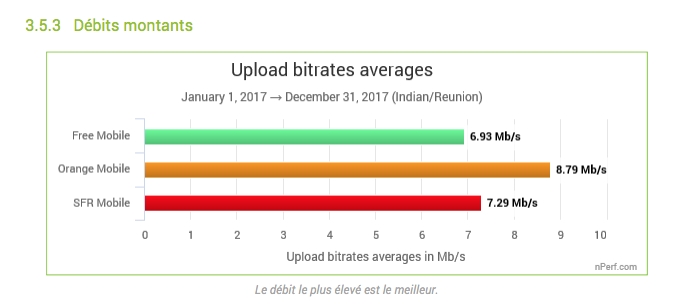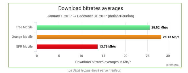 Par ailleurs Orange a fourni le meilleur débit descendant mobile à La Réunion au cours de l’année 2017. Orange devance Free de 2,61 Mb/s et SFR de 14,34 Mb/s.
