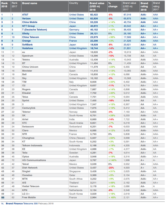 Brand Finance a dévoilé son classement 2018 des marques de télécommunications les plus importantes au monde. Le cabinet d’analyse britanique explique que si les opérateurs américains continuent de truster le haut du classement les marques chinoises ont le vent en poupe avec China Mobile (3e). Pour la France, Orange est présent à la huitième place, SFR à la 33e et Free fait son entrée dans le top 50 avec une forte progression (+40%), Bouygues se place en 52 position.