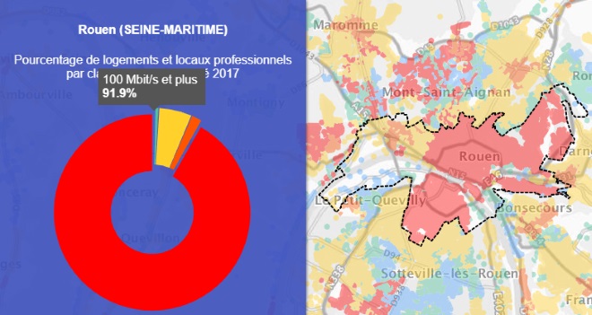 Grâce à la première carte on peut voir que la ville de Rouen est couverte à 93.7% par le très haut débit.