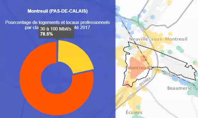 Grâce à la première carte on peut voir que la ville de Montreuil est couverte à 78.5% par le très haut débit.