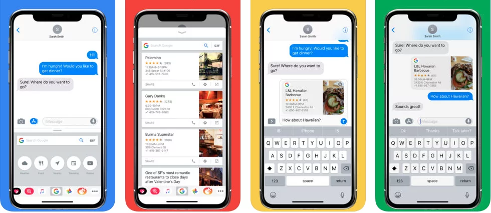 Une fois installée l’application, l’extension propose à chaque fois que vous envoyez un message à un ami la possibilité de faire des recherches sur le web mais aussi de partager des GIF, un restaurant ou encore des vidéos YouTube.