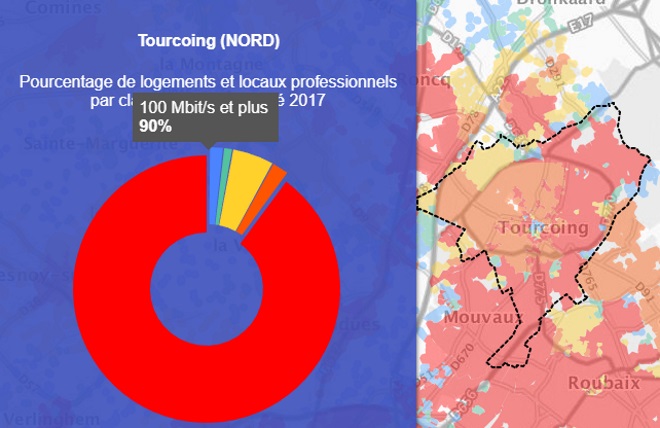 Grâce à la première carte on peut voir que la ville de Tourcoing est couverte à 90% par le très haut débit.