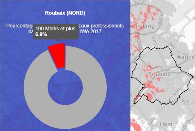 Grâce à la première carte on peut voir que la ville de Roubaix est couverte à 92% par le très haut débit.