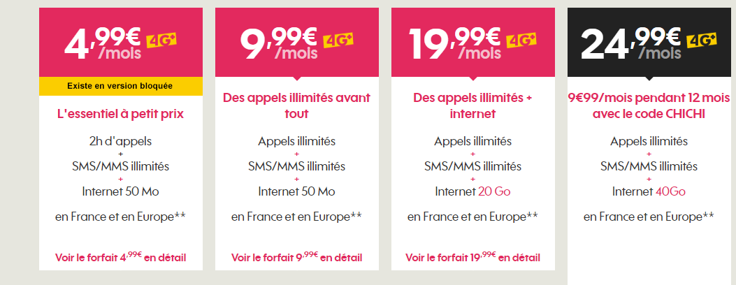 Le forfait comprend 40 Go/mois d’internet mobile en France sur le réseau Orange (3G, 4G/4G+) et en Europe. Les appels, SMS, MMS sont illimités en France et depuis l’Europe (depuis les zones Europe, Suisse/Andorre et DOM vers ces mêmes zones et la France métropolitaine). Les SMS sont également illimités depuis la France vers l’Europe (zones Europe, Suisse/Andorre et DOM)et les appels sont illimités depuis la France métropolitaine vers les fixes d’Europe (zones Europe, Suisse/Andorre et DOM) ainsi que vers les fixes et mobiles des USA et du Canada.