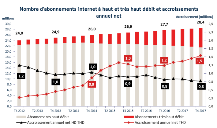 Au cours du quatrième trimestre 2017, le nombre d’abonnements très haut débit (débit maximum descendant supérieur ou égal à 30 Mbit/s) a progressé de 475 000 pour atteindre 7 millions ; 1,5 million d’abonnements supplémentaires ont ainsi été enregistrés en un an, contre 1,2 million un an auparavant.