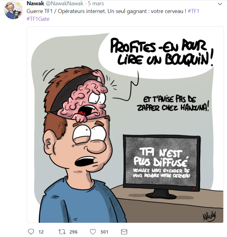 TF1 n’est plus diffusé sur Canal depuis la fin de la semaine dernière et devrait disparaître également des offres de Free ce week-end si aucun accord est trouvé. Ce sujet brûlant a inspiré le dessinateur Nawak.