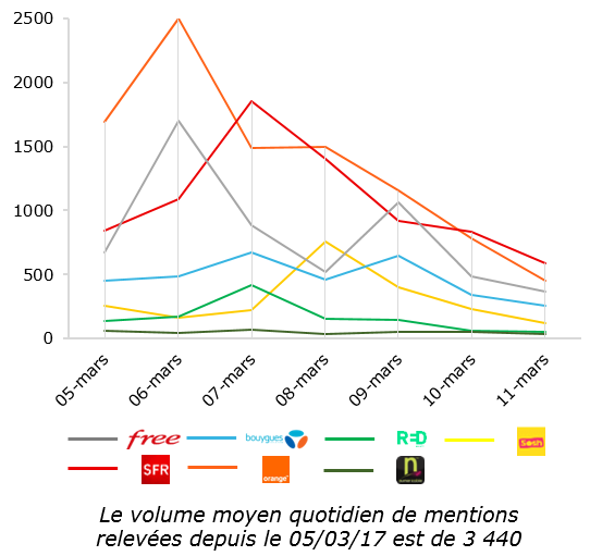 Netino (Webhelp) et Synthesio viennent de publier leur étude hebdomadaire sur la perception sociale des principaux opérateurs télécoms sur le marché français pour la semaine du 5 au 11 mars 2018. Cette étude se base sur la collecte automatique des données sur un corpus de plus de 600 000 000 sites, blogs, forums, profils Facebook et Twitter.