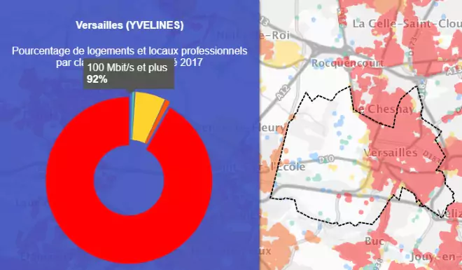 Grâce à la première carte on peut voir que la ville de Versailles est couverte à 93.1% par le très haut débit.
