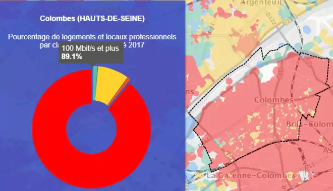 Grâce à la première carte on peut voir que la ville de Colombes est couverte à 90% par le très haut débit.