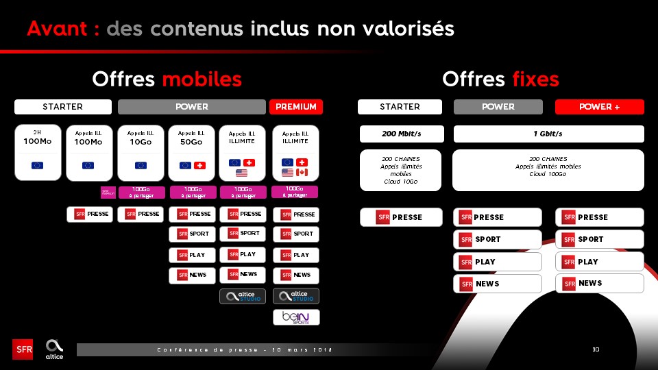 Lors de sa conférence de presse présentant la stratégie pour redresser l’opérateur, Alain Weill, le président du groupe SFR entouré de la nouvelle équipe de direction a officialisé l’évolution des offres fixes et mobiles.