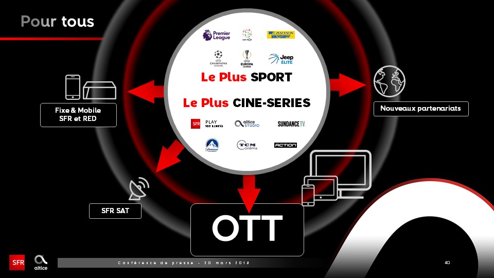 Ainsi, le bouquet de chaînes RMC Sports sera disponible en OTT chez les autres opérateurs. Par ailleurs SFR est en négociation pour intégrer les bouquets TV Free, Bouygues Télécom et Orange. Pour regarder la Ligue des Champions ou tout autre événement sportif dont SFR a acquis les droits sans être abonnés SFR il faudra donc débourser 15 euros/mois. L’option Ciné-Séries sera également disponible au prix de 10 euros/mois pour les non abonnés SFR.