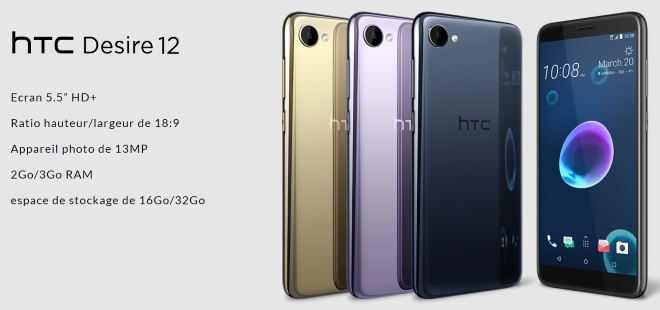 HTC annonce aujourd’hui l’arrivée en France de nouveaux terminaux pour le deuxième trimestre 2018. Il s’agit des HTC Desire 12 et Desire 12+, qui reprendront certains éléments du U11+ au niveau de leurs apparences. Il jouera sur son design, ses caractéristiques modestes ainsi que sur son prix afin de se démarquer de la concurrence. Le modèle classique sera commercialisé à partir de 179 euros tandis que le Desire 12+ sera disponible au prix de 229 euros.