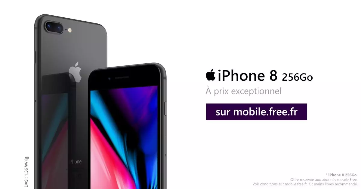 Free annonce le lancement d’une offre promotionnelle sur l’iphone 8.Ce smartphone est proposé, à 859€ au lieu de 959€, soit une réduction de 100€. Cette offre est valable également sur le paiement en 4 fois sans frais : 217€ à la commande puis 3 fois 214€.