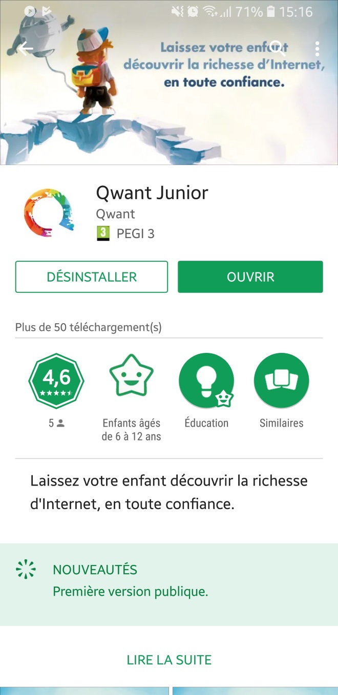 Cette version de Qwant, destinée aux jeunes de 6 à 12 ans, permet de délivrer un accès sécurisé à internet, exempté de tout contenu inapproprié pour les enfants comme les contenus pornographiques, violents, radicaux… Un petit plus qui n’est pas des moindres, l’application ne contient pas de publicité et n’exploite pas non plus les données personnelles.