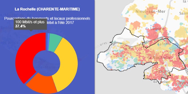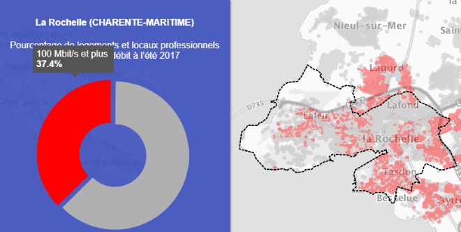 Grâce à la première carte on peut voir que la ville de La Rochelle est couverte à 55.4% par le très haut débit.