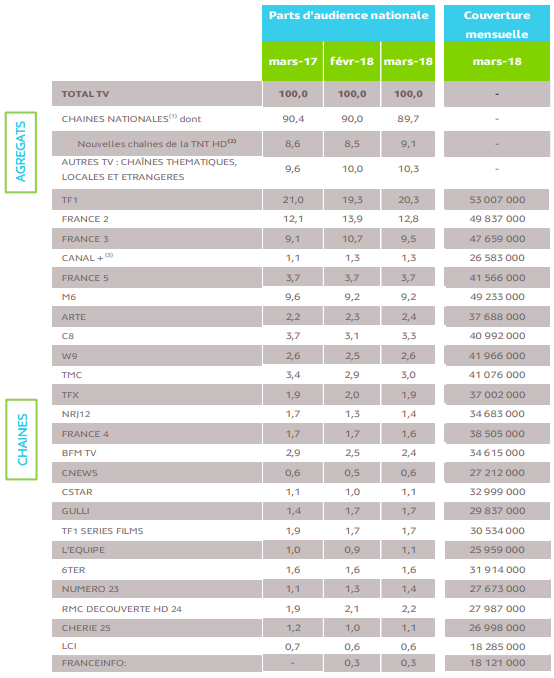 Comme on peut le constater, par rapport à la même période l’année dernière, TF1 a perdu 0,7 point à 20,3% (contre 21% en mars 2017). Toutefois, la chaîne est en hausse par rapport au mois de février, avec +1 point.