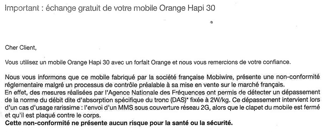 Le courrier envoyé aux clients concernés (0,3% soit 90 000 personnes selon 60 millions de consommateurs) précise que ce sont des mesures de l’Agence Nationale des Fréquences qui “ont permis de détecter un dépassement de la norme du débit dite d’absorption spécifique du tronc (DAS) fixée à 2W/kg”, ici les mesures affichent 2,1W/kg.
